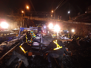 道床とは枕木の下に入れる砂利・砕石などのバラストでできた層のことです。列車荷重を路盤に広く分散させ、軌道に弾性を与えるクッションのような役割をしています。道床の砂利の交換や補充、突き固めといった作業を行います。